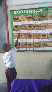 Multiplicador Orquídeo de Moçambique, trabalhando com o método das boquinhas, na Escola Primária Menino Jesus, o aluno da foto é Anderson Dórian Benjamin Moiane, de 6