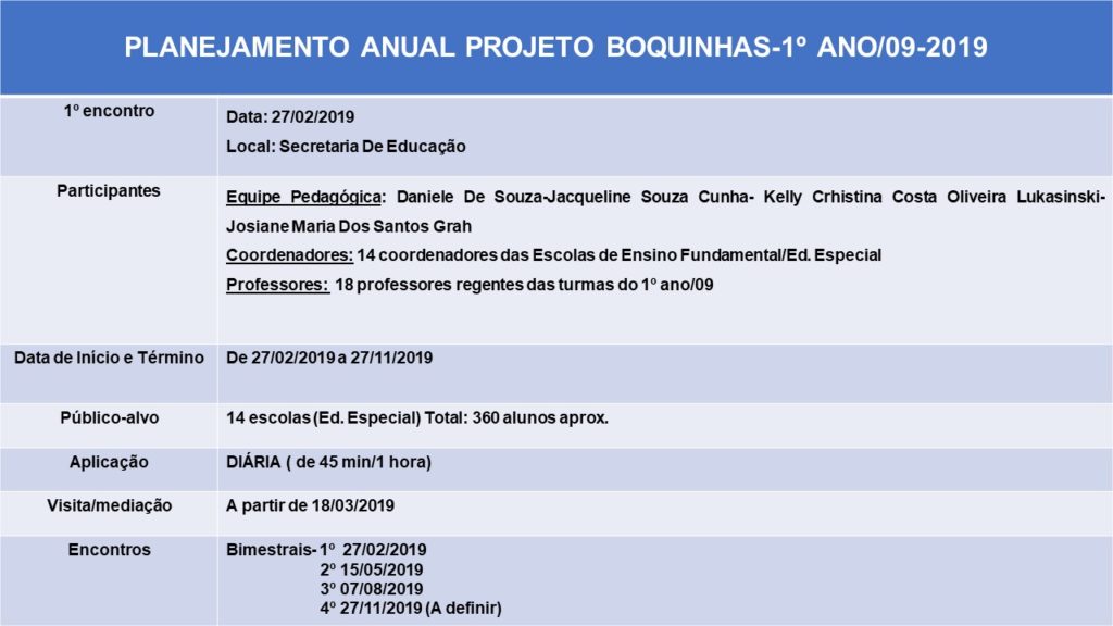 Durante o ano de 2019, 14 escolas da rede municipal de Educação de Rio Negro no Paraná, receberam a capacitação Plena de Boquinhas, e portanto o método foi implantado nessas escolas, alcançando em média 360 alunos sendo trabalhados e acompanhados para comparação de resultados.