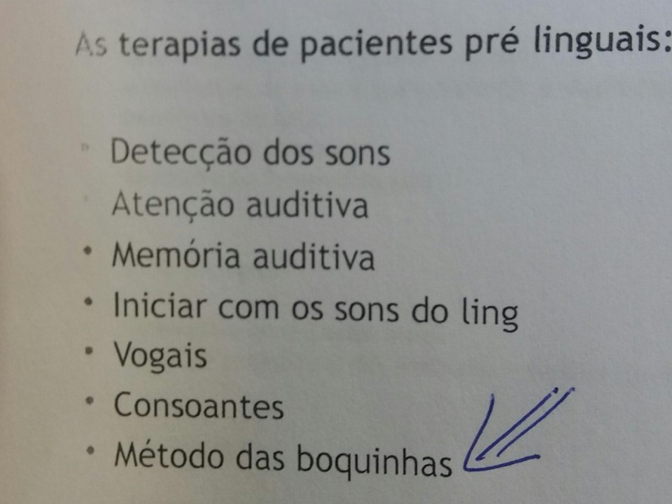 Durante sua apresentação a Fonoaudióloga Roberta Esposito Itz, membro da equipe de terapeutas desse Hospital, destacou o Método das Boquinhas como eficaz na terapia para aquisição da fala dos pacientes pré-linguais submetidos à cirurgia de IC, ou seja, pacientes que nasceram surdos ou perderam a audição antes de adquirir a linguagem oral.